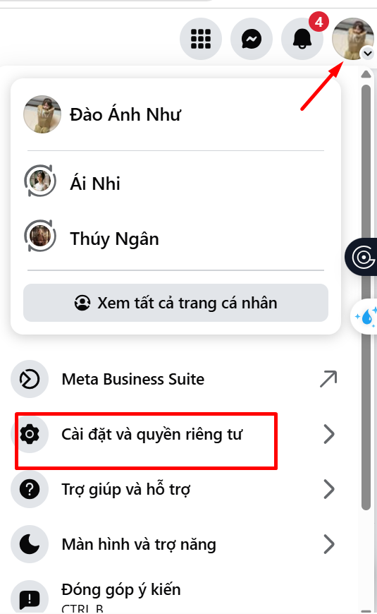 Nhấp vào ảnh đại diện phía trên bên phải của bạn sau đó chọn bạn chọn Cài đặt & quyền riêng tư. Rồi tiếp tục chọn Cài Đặt