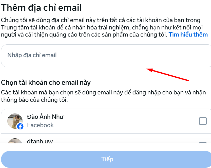 Tích chọn vào tài khoản Facebook mà bạn muốn liên kết email này (nếu bạn dùng chung Trung tâm tài khoản cho cả Instagram).