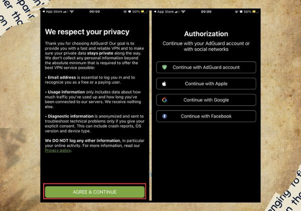 - Bước 2: Khi mở ứng dụng lần đầu, chọn Agree & Continue, sau đó đăng nhập vào AdGuard bằng tài khoản sẵn có như Apple, Google hoặc Facebook; bạn cũng có thể sử dụng tài khoản AdGuard nếu đã đăng ký trước đó.
