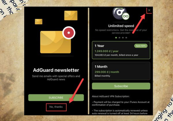 - Bước 3: Trong trường hợp bạn không muốn nhận thông báo về tin tức hay các bản cập nhật tính năng từ AdGuard, hãy chọn No, thanks hoặc nhấn vào biểu tượng X.