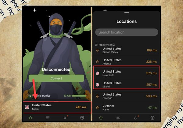 - Bước 4: Trước khi kích hoạt VPN, hãy truy cập mục lựa chọn khu vực và chọn quốc gia bạn muốn kết nối. Những máy chủ có chỉ số ping (ms) thấp thường cho tốc độ ổn định và nhanh hơn. Tuy nhiên, phiên bản miễn phí chỉ cho phép sử dụng một số khu vực nhất định; để truy cập đầy đủ các vùng, bạn cần nâng cấp lên gói trả phí.